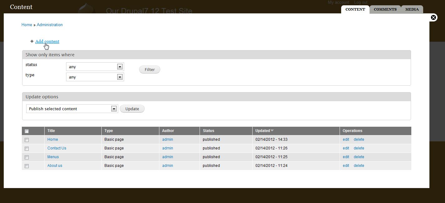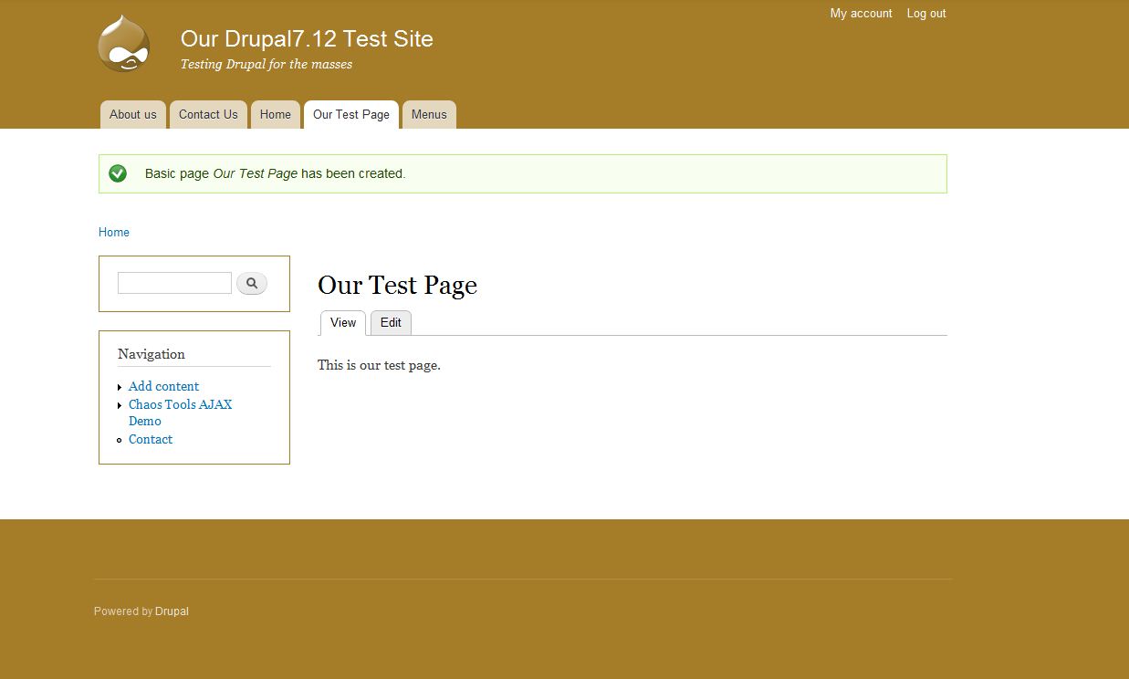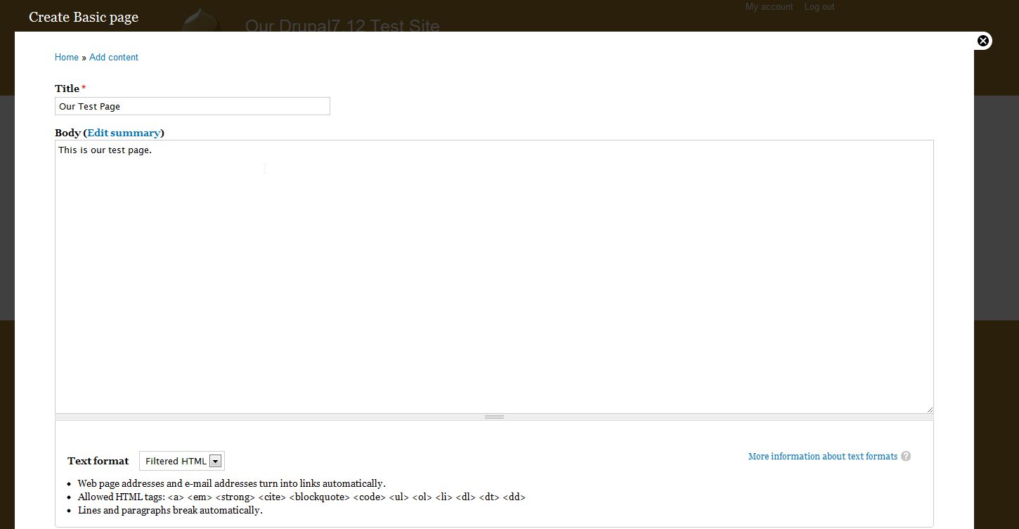 Title Enter a title for you new page. In our testing we entered Our Test Page, but you could use anything that you would like, such as About Us. Body The body is the bulk of the content for this new page. If this was an About Us page, this would be were you would enter the information about yourself or your organization. In our example, we simply entered This is our test page. Text Format When selecting a text format, you have the following options: