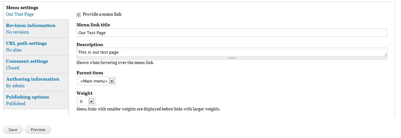 Menu Link Title When this link appears in a menu, this will be the text that users can click on to get to this page. Description If a user mouses over this link, after a moment the description you type here will show. Parent Item Choose the parent item for this page. For example, if we later created a Company History page, we may want to file it underAbout Us, and we could do that here. Weight you can adjust the weight to change in which order this link will appear. Revision Information If you have multiple authors or if you just like keeping detailed notes, in the revision information section you can enter a description about the changes you are making to the page. URL Path Settings This option allows us to specify a custom url alias. For example, if we leave this option blank, the URL will look similar to: